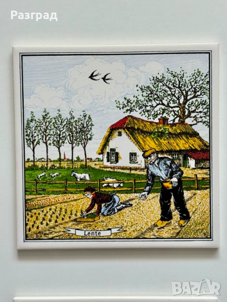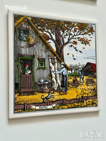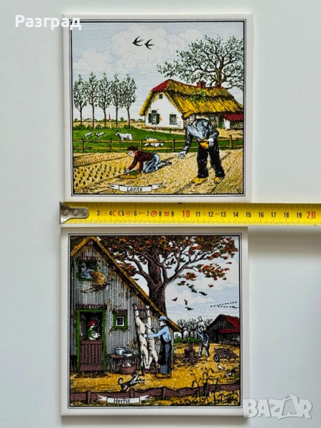 Винтидж декоративни плочки за окачване на стена изобразяващи фермерски рисунки от сезони пролет и есен. Керамика произведена от Royal Holland. В чудесно винтидж състояние. Размер 15х15см.