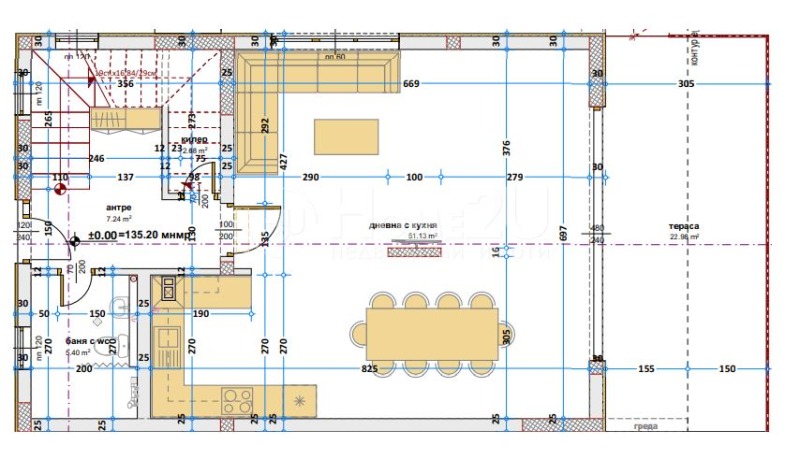 Етаж 1 - просторен дневен тракт с кухненски кът с излаз на тераса, баня и тоалетна ведно;