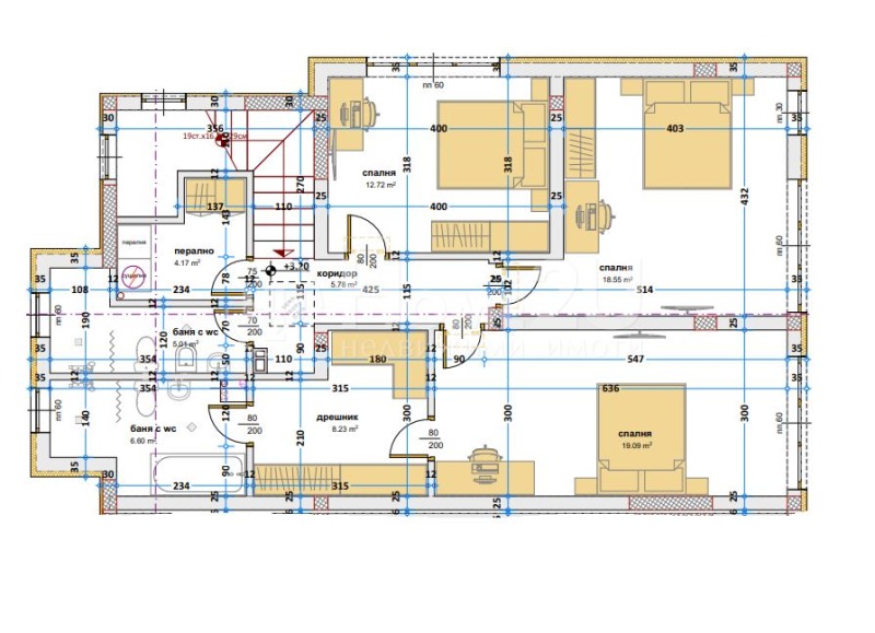 Етаж 2 - родителска спалня със собствен дрешник и баня и тоалетна, втора спалня, трета спалня, баня и тоалетна ведно, перално помещение;