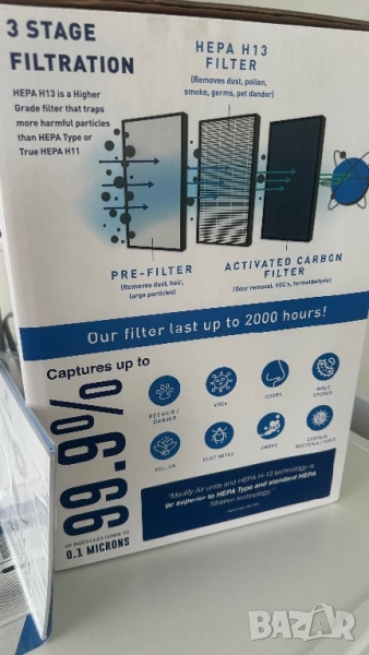 3-слойният хепа филтър премахва вредните замърсители от въздуха 99,9% на всеки 30мин.