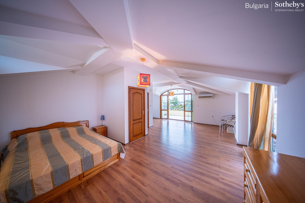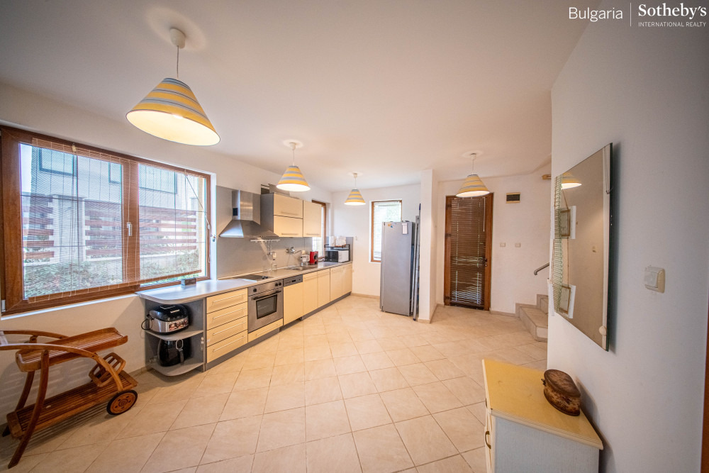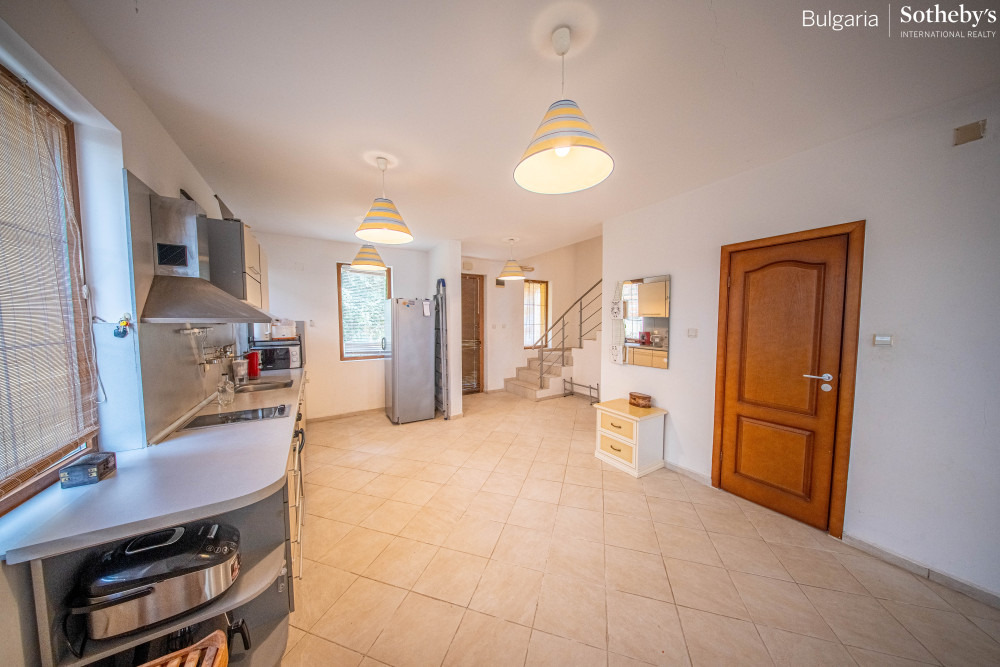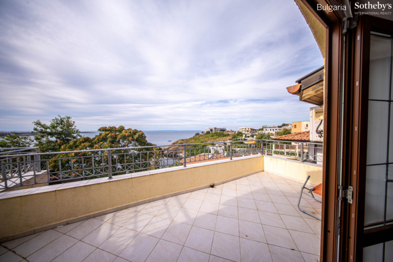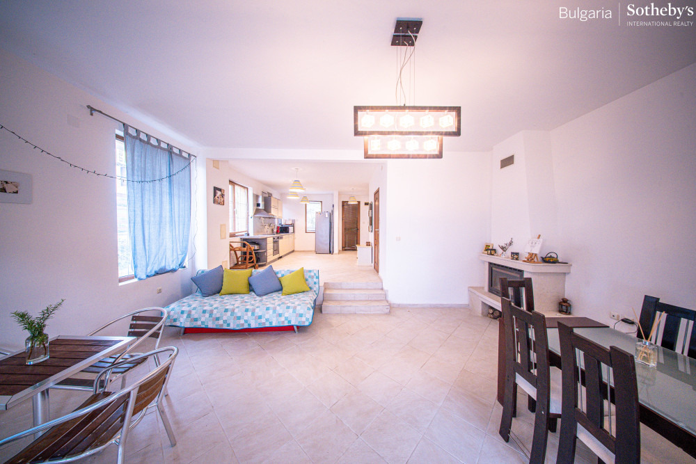 Имотът е с разгърната площ от 234 кв.м, разпределен на три нива, и впечатлява с класическа архитектура и фантастични панорамни гледки към морето от всяко помещение. Къщата е крайна в комплекса, което гарантира повече уединение и просторен двор, и се предлага напълно обзаведена и готова за нанасяне.