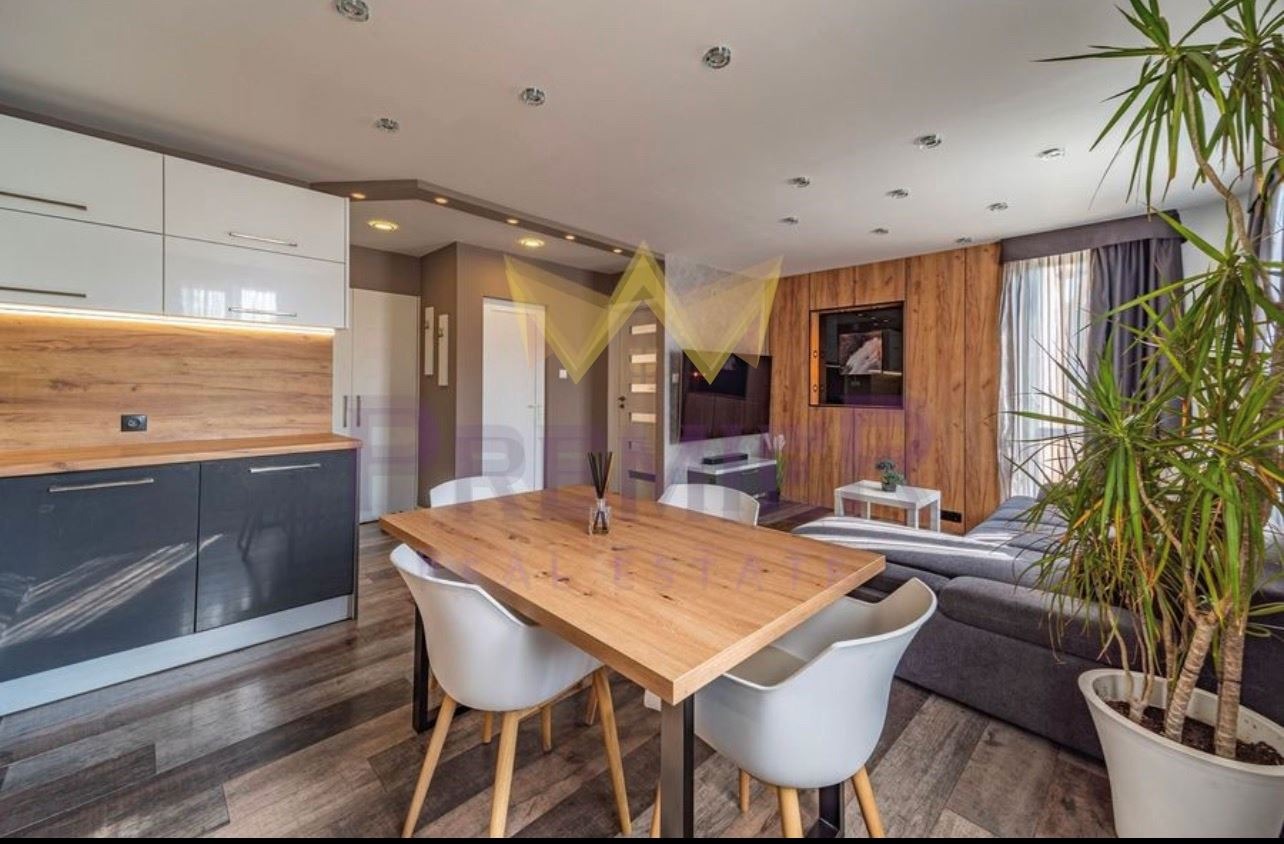 Дневният тракт е просторно и светло помещение, комбинирано с кухненски бокс, което създава усещане за отворено пространство. Дневната е обзаведена с удобен диван, холна маса и телевизионен кът. Кухненският бокс е напълно оборудван с модерни уреди, включително хладилник, готварска печка, котлони и абсорбатор. Пространството е функционално и предлага удобства за ежедневна употреба.