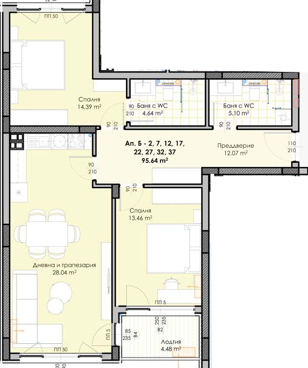 ✅ Жилището се състои от входно антре, хол с кухня,две спални, тераса,две бани с тоалетни, изба.