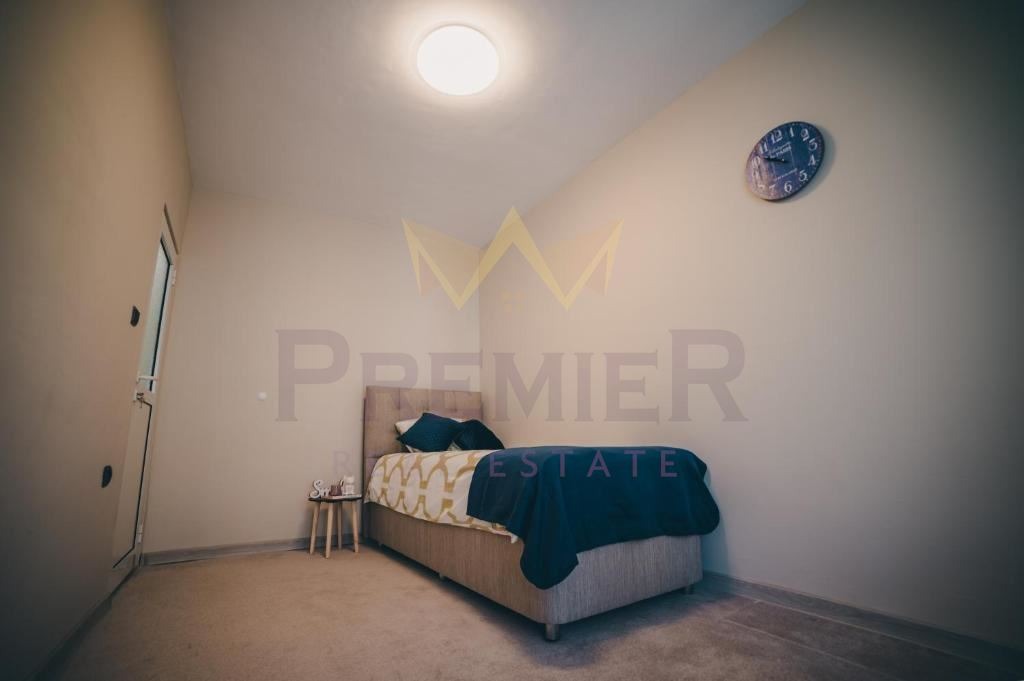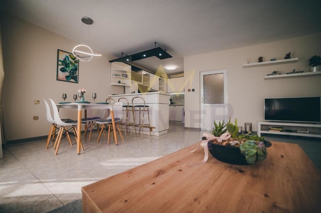 Дневният тракт е с отворен план, обединявайки просторна всекидневна с кухненски бокс. Всекидневната е обзаведена с удобен диван, маса и телевизионен кът, което създава уютна атмосфера за отдих и събирания.