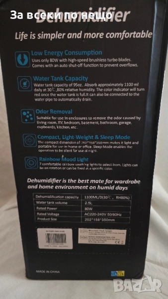 Продавам чисто нов Влагоабсорбатор. Модел СS 06! Влагоабсорбатора е нов модел, и върши уникална работа. Свети и си сменя цветовете. Kaпацитет 1100МЛ/ D ( 30° RH 80 %) 2,5 L, 80 W! Размер 202*158 *350mm