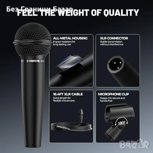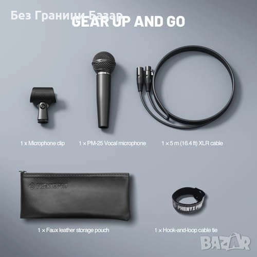 Пълен комплект: 5 м XLR кабел, държач за стойка, калъф за съхранение