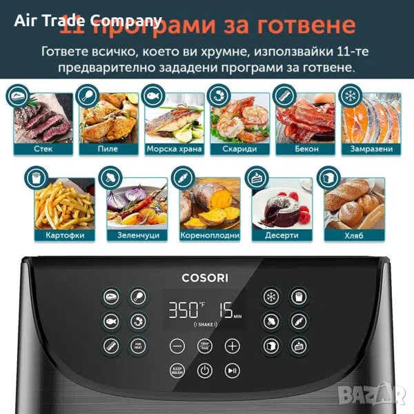 Уредът за готвене с горещ въздух Cosori Pro Air Fryer разполага с 11 предварително създадени програми за готвене. Това ви дава голяма свобода и възможност да приготвяте пиле, стек, морска храна, картофки, зеленчуци, десерти, хляб и други.