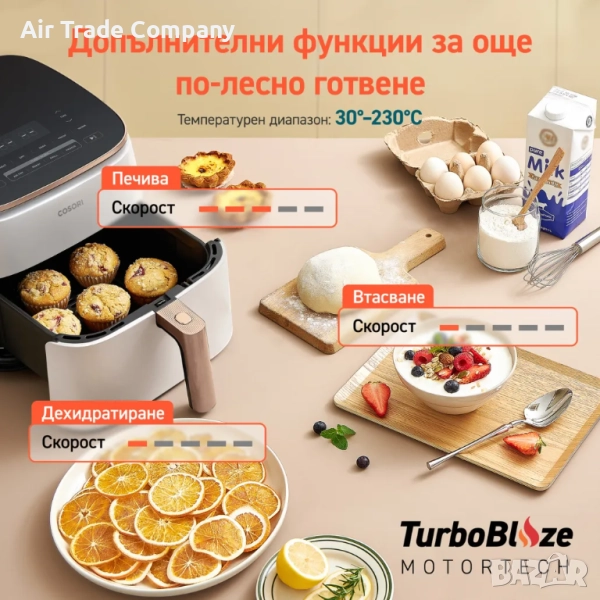 Cosori TurboBlaze е създаден в Калифорния. Cosori е бранд номер едно по продажби в САЩ и носител на множество престижни награди.