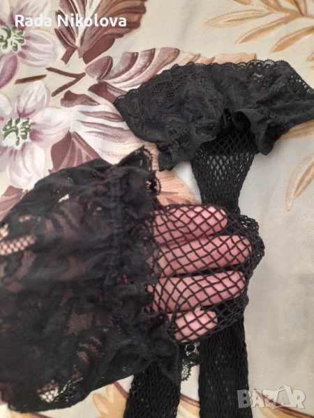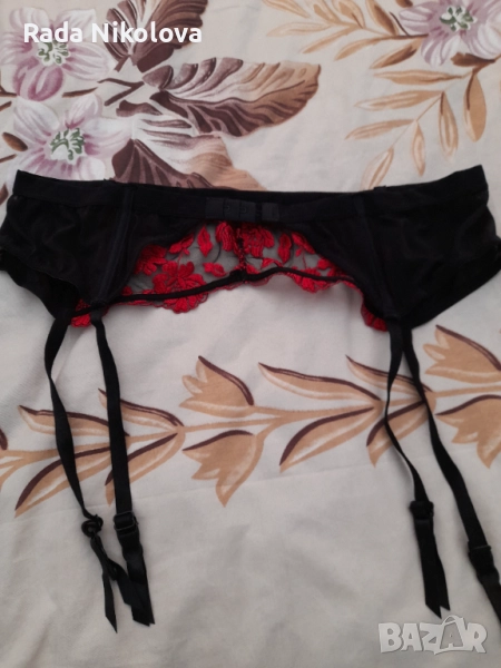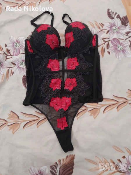 Продавам дамско дантелено секси боди в черно на червени рози, жартиери тип мрежа и колан за жартиерите.Не са обличани нови са.