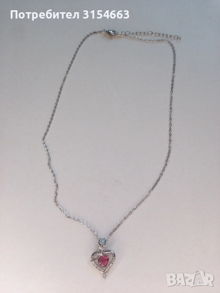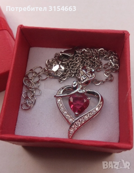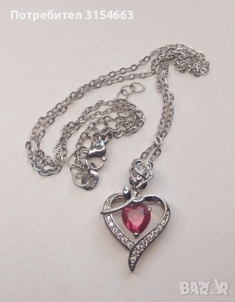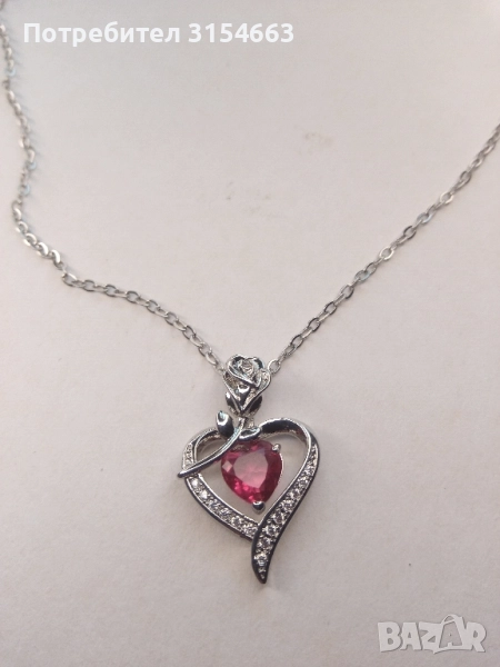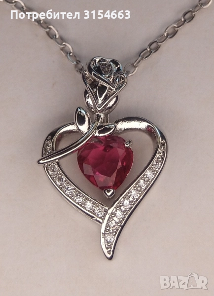 Колие с кристали. Форма на сърце с роза. Размери на сърцето 1,7 см на 2,8 см. Верижка с дължина 50 см. В подаръчна кутийка.
