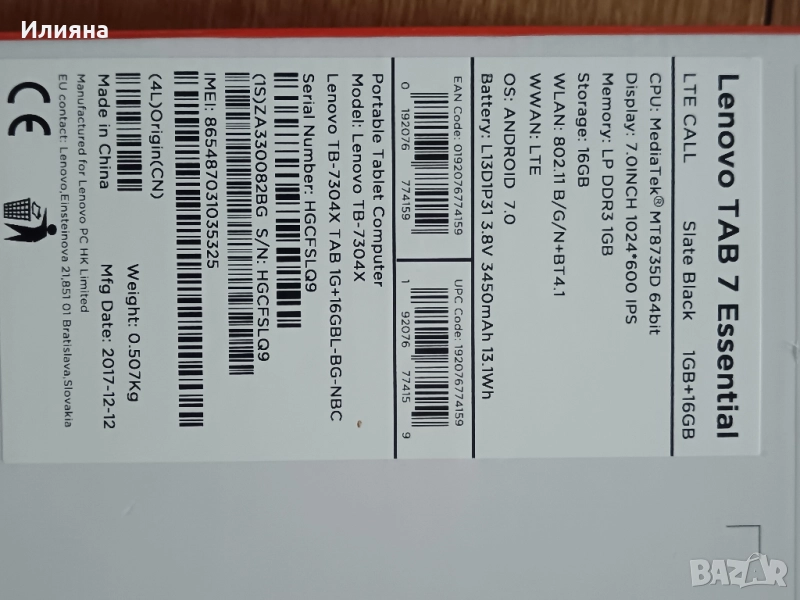 - Модел: Lenovo TB-7304X - Цвят: Slate Black - Дисплей: 7.0" IPS, 1024x600 - Процесор: MediaTek MT8735D, 64-bit - RAM: 1GB - Памет: 16GB (разширяема с карта) - ОС: Android 7.0 - Свързаност: LTE (SIM карта), Wi-Fi 802.11 b/g/n, Bluetooth 4.1 - Батерия: 3450 mAh - Тегло: 507 г - Поддържа SIM карта и разговори - Подходящ за интернет, социални мрежи, видео и приложения