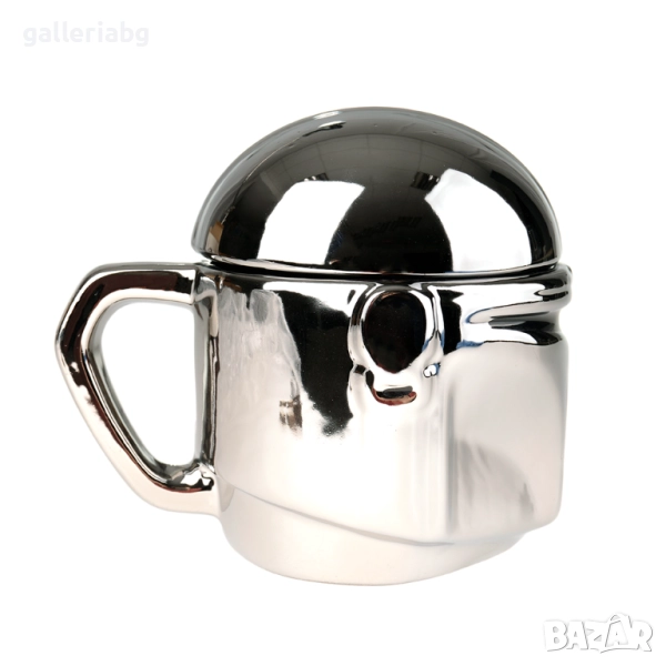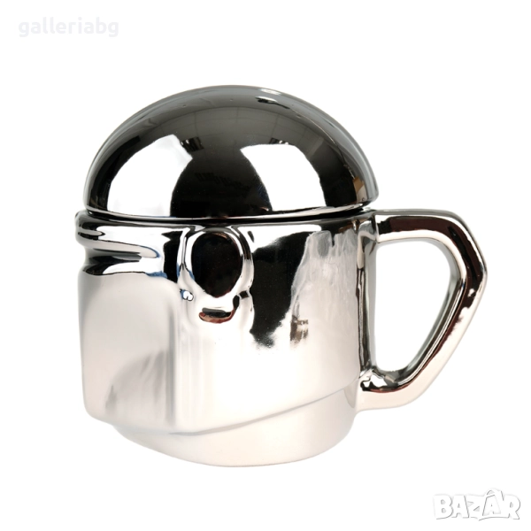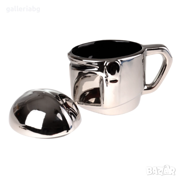 Стилна керамична чаша с 3D релеф във формата на шлем киборг Mandalorian 🤖. Подходяща както за фенове и колекционери, така и за ежедневна употреба.