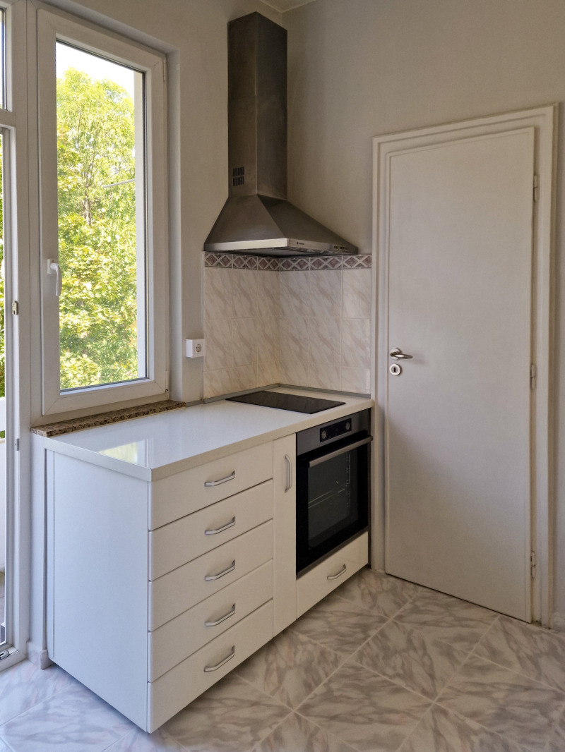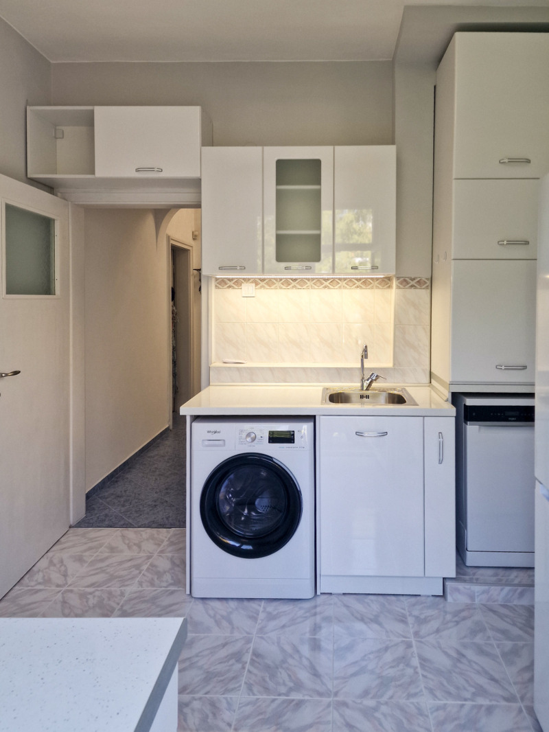 - Кухня с излаз към тераса, гледаща към вътрешен озеленен двор. Напълно оборудвана с вградена фурна, керамични котлони, аспиратор, голям хладилник, миялна машина, микровълнова печка.