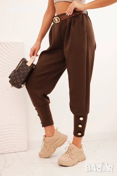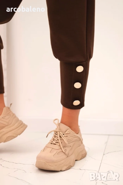 Крачолите се стесняват надолу, завършвайки с широк маншет, украсен с декоративни златни копчета – тези детайли привличат погледа и придават на цялото изделие уникален характер. Материята приляга добре на силуета, осигурявайки комфорт през целия ден.