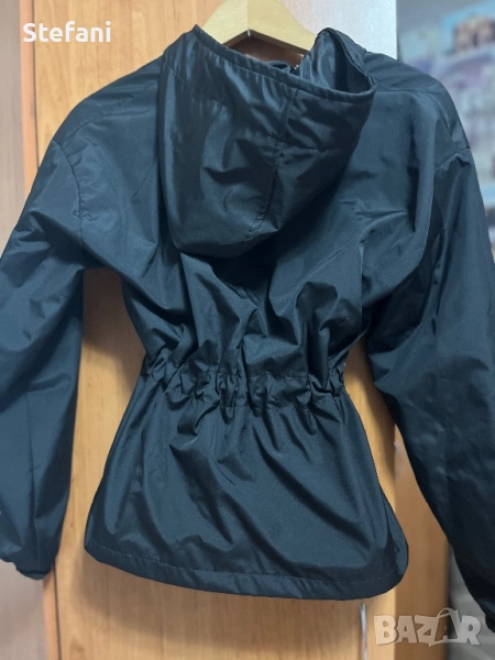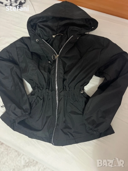 Черно дамско яке с дълъг ръкав и качулка. Якето е носено само няколко пъти като ново е и няма никакви забележки по него..