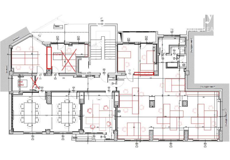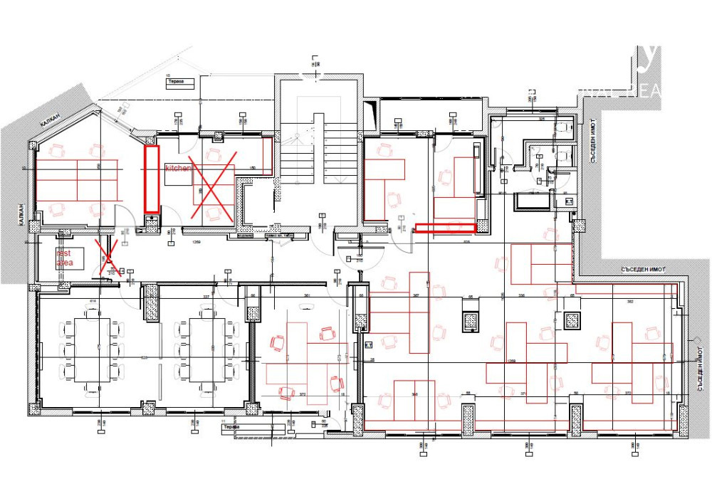 Разпределение:коридор, голямо "open space" помещение, кухня, тоалетна, четири отделни работни помещения.