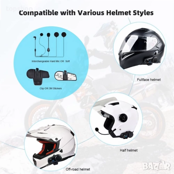 【Лесен за потребителя интерком за каски】Водоустойчивата функция осигурява предимство при лошо време, можете да използвате Bluetooth слушалките за интерком за каска FX6 в дъждовни/снежни дни. Универсалната Bluetooth комуникационна система за мотоциклети се свързва с други марки/модели слушалки за мотоциклети. Bluetooth слушалките за каска се предлагат с микрофон за 3/4 отворена каска/каца с отваряне на лице/модулна каска и мек кабелен микрофон за каска с пълно лице.