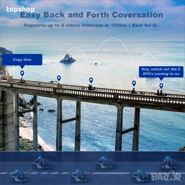 интерком за мотоциклет до 6 мотоциклетисти, 1000 м комуникационна система за каска/гласово набиране/универсално сдвояване/FM радио (1 комплект)