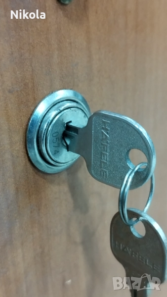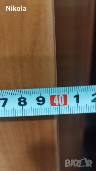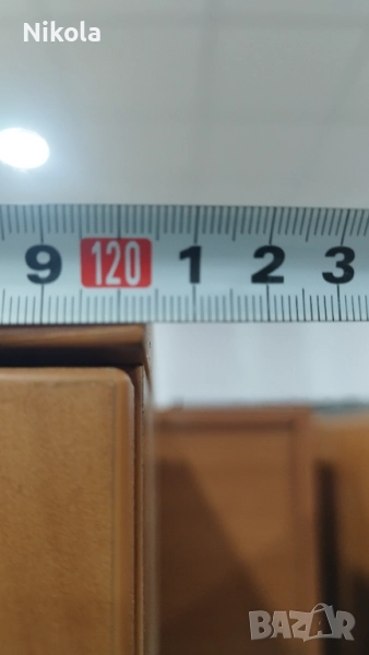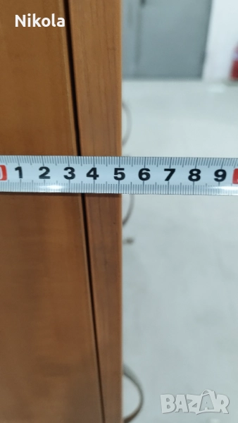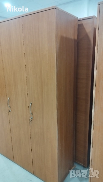 Гардероба е с размер ширина 120см, височина 201см и дълбочина около 45см. Налични са 2бр - с 3 крила. Разпределението за всяко крило е 2рафта и 4 закачалки във всяко гардеробче. Гардеробите са запазени с добре работещ обков панти и ключалки. Цвета е червеникаво кафяв - Череша.