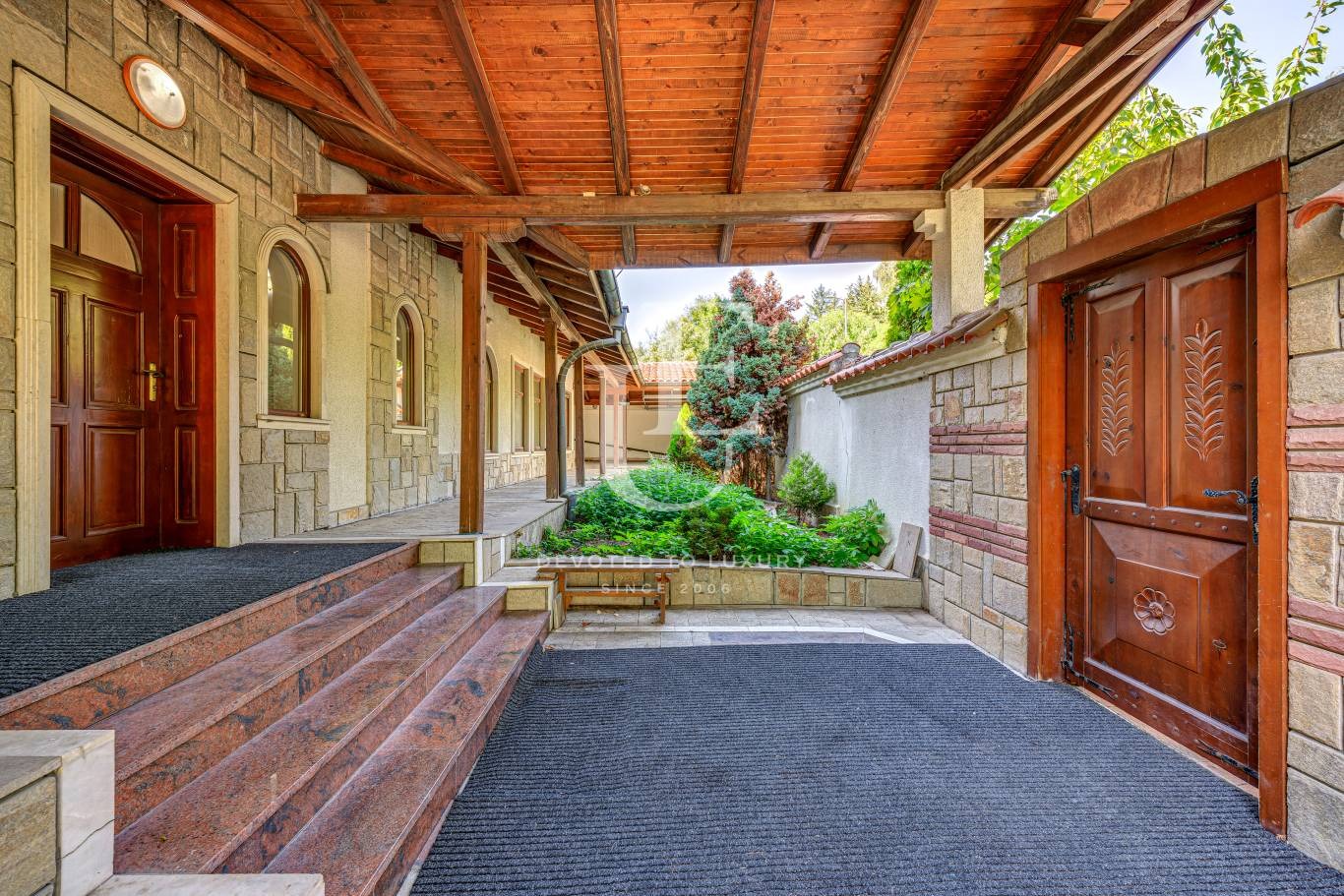 Просторната градина е красиво озеленена и предлага отлични условия за отдих, семейни събирания и пълноценен живот сред природа, съчетавайки комфорт, уединение и престиж.