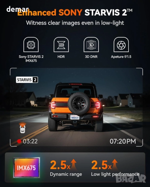 Видеорегистраторът WOLFBOX X3 записва с висока резолюция 2.5K и 60 кадъра в секунда отпред и 1080P и 30 кадъра в секунда отзад, използвайки сензор STARVIS 2 за ясни кадри дори при слаба светлина. Той включва ADAS функции, като например напускане на лентата за движение, разпознаване на пешеходци и предупреждения за спиране и движение, с лесно управление чрез сензорен екран. Вграденият 5.8GHz WiFi позволява бърз трансфер на данни през приложението, докато GPS регистрира скорост и местоположение за точни данни за пътуването. Двойният HDR осигурява балансирани кадри както при светли, така и при тъмни условия, а камерата се предлага с предварително инсталирана 64GB SD карта за незабавна употреба. Забележка: Функцията за 24/7 наблюдение на паркирането изисква закупуване на допълнителен хардуерен комплект.