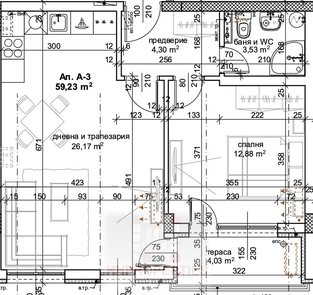 Апартаментът е с обща площ 69,43 кв.м (чиста площ 59,23 кв.м) и предлага функционално разпределение: