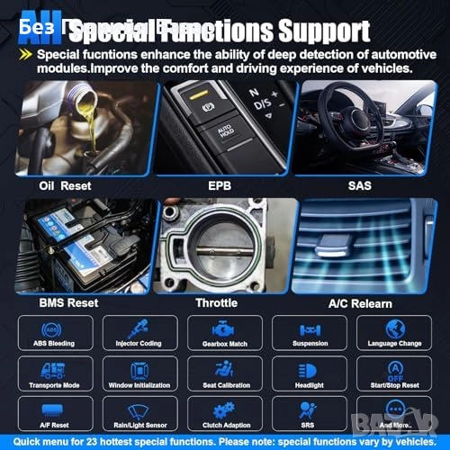 23 специални функции – EPB Reset, SAS Reset, ABS Bleeding, инжектор кодиране, климатик, окачване и др.
