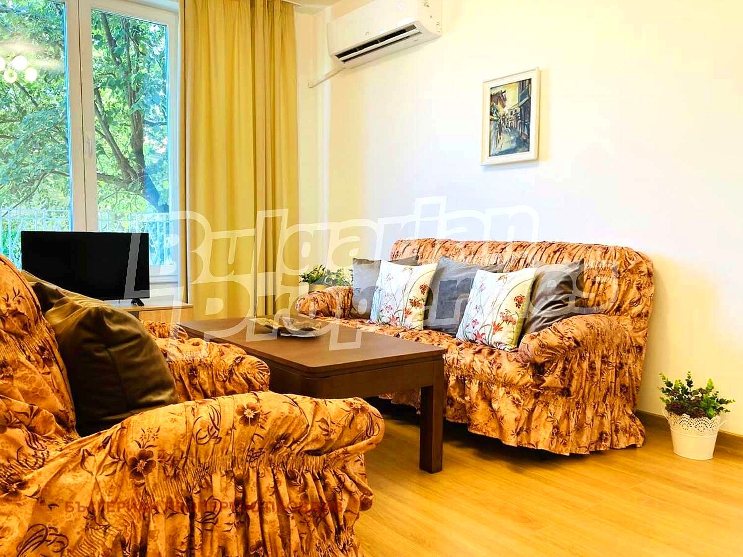 Жилището е напълно обзаведено и готово за нанасяне. Разполага с три климатика, стенен радиатор, пералня, сушилня, миялна машина и висококачествени уреди Miele, които гарантират дълготрайна употреба и удобство. Подовете са с ламиниран паркет, дограмата е PVC, а стените са освежени в светли и топли тонове, придаващи уют и простор. Апартаментът е оборудван със съвременна система за отопление и охлаждане три климатика и стенен радиатор, което осигурява оптимален комфорт през всички сезони.