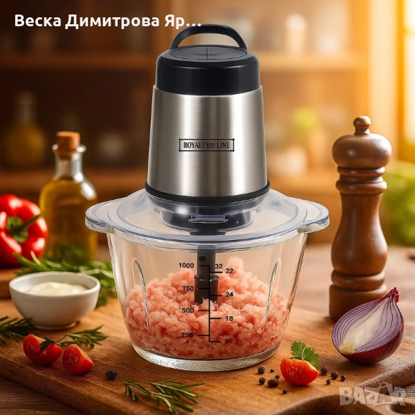 Марка: Royalty Line; Модел: MCE-300.34.1; Мощност: 300W; Захранване: 220-240V ~ 50/60Hz; Капацитет на купата: 1.2 литра (дебело стъкло); Остриета: Подвижни, неръждаема стомана; Функции: Две скорости, предпазен превключвател, лесно управление с един бутон; Поддръжка: Лесно разглобяване и почистване; Допълнителни елементи: Неплъзгаща се подложка за стабилност; Гаранция: 12 месеца.
