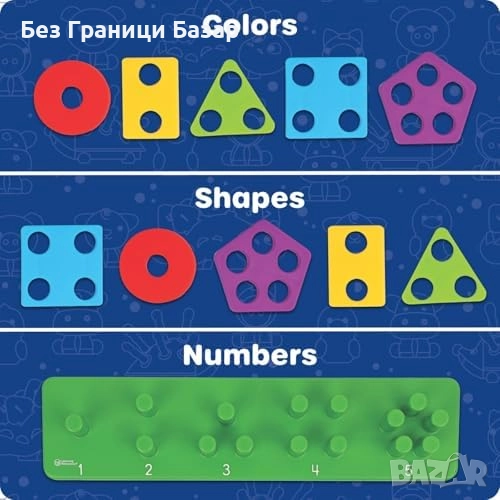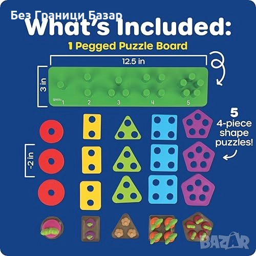 Включва 21 части: пъзел дъска с колчета, 5 форми с по 4 части и ръководство