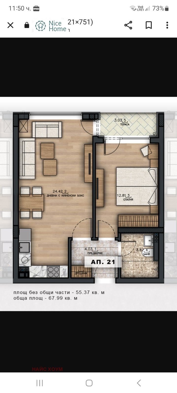 АКТ 16. Агенция за недвижими имоти 'Найс Хоум' представя на своите клиенти просторен, в нова сграда, двустаен апартамент. Жилището се състои от хол с кухненски бокс, спалня, баня с тоалетна, коридор и тераса. Имотът е в нова кооперация с акт 16. Подходящ е както за живеене, така и с цел инвестиция ( гарантиран месечен наем 1200 лева). Сградата е газифицирана. Апартаментът е вътрешен и много топъл. В районът е много добре устроен. В близост има метростанция, училища, университети, големи хранителни магазини и множество спирки на градски транспорт. За контакт и огледи се обадете на:0878421100. Агенцията разполага с ключ!