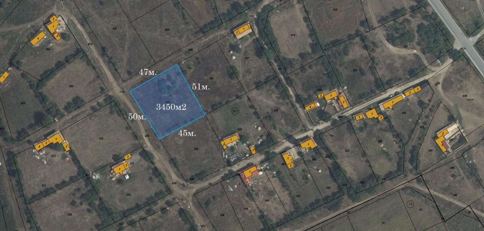 Имотът е с площ от 3450 кв.м., разположен е в спокоен, екологично чист район, с лице на две улици - 50 м и 47 м, което осигурява лесен достъп и възможност за различни архитектурни решения.