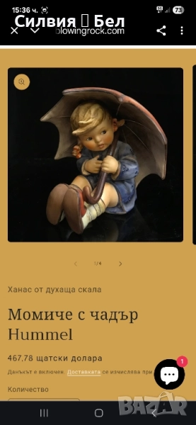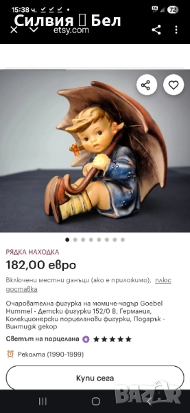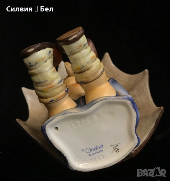 Търсите ли очарователна колекционерска фигурка, която да украси дома ви или да я подарите? Ако е така, може би ще се заинтересувате от фигурката на Goebel Hummel Umbrella Girl. Тази фигурка е част от известната серия Hummel, базирана на дизайна на сестра Мария Инокентия Хумел, немска монахиня и художничка. Тя има изразително лице, детайлно облекло и ярки цветове. Изработена е от висококачествен порцелан и е ръчно рисувана от опитни майстори. Долната страна също така съдържа официалната търговска марка и номер на модела на Goebel. Фигурката е в отлично състояние, без отчупвания, пукнатини или ремонти. Висока е приблизително 12,5 см. Произведена е в Западна Германия през 80-те години на миналия век. Това е рядка и ценна фигурка, търсена от колекционери и ентусиасти по целия свят.Ако искате да притежавате тази красива и вечна фигурка, не пропускайте тази възможност. Фигурките на Goebel са прекрасен начин да украсите дома си или да я подарите на любим човек. Порцелановите фигурки Goebel са чудесна идея за подарък за новодомци, декорация за хол: фин порцелан, идея за подарък от винтидж порцелан - фигурки Goebel. Цена 2️⃣0️⃣0️⃣лв 102,25 €. ❥⊱╮🩷☆♪ ░─❥⊱🩷✿L░o░V░e░❥─❥⊱🩷✿⊱╮🩷☆♪ღ