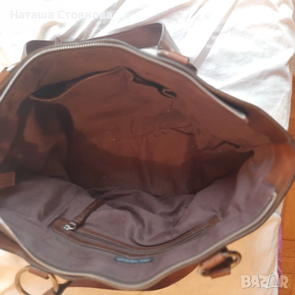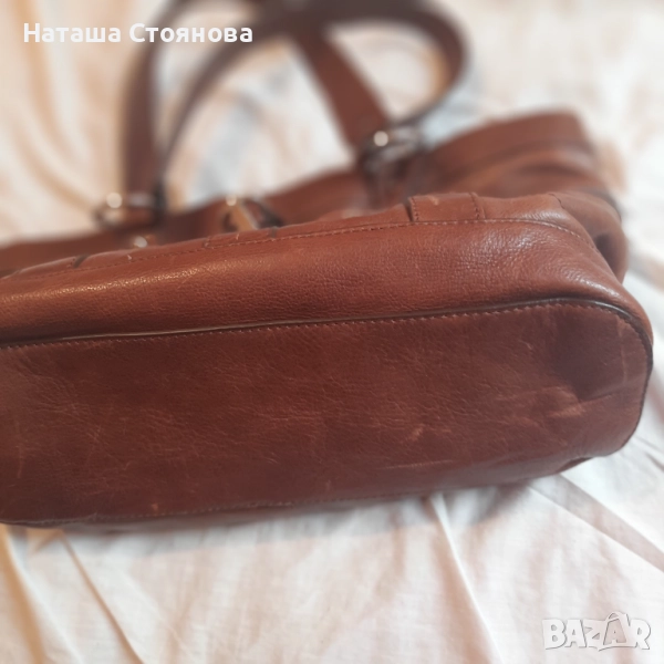 Естествена кожа (телешки бокс), плътна, тежка, с много вътрешни и външни джобове, маркова, висок клас, в отлично състояние. Размери 46/26, дъно 11 см. Приемам сериозни предложения.