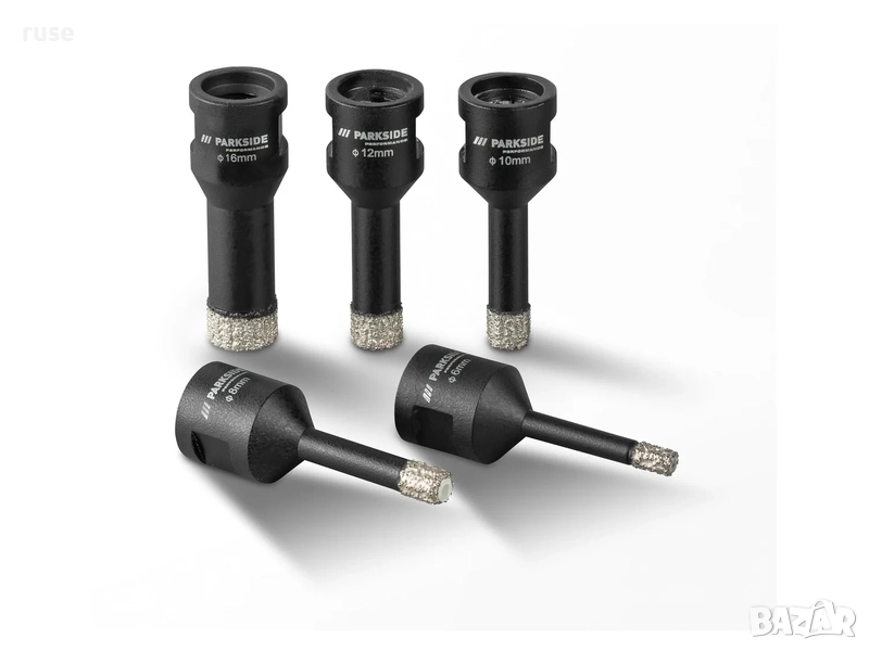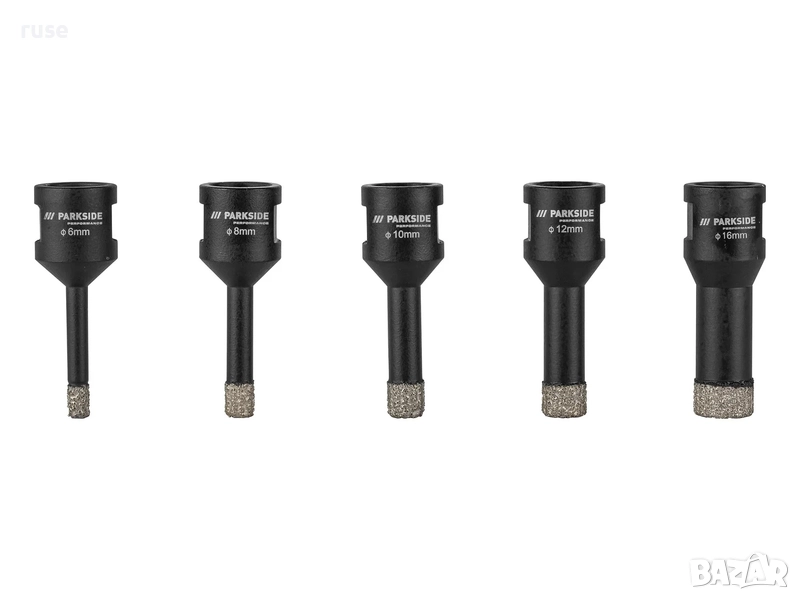 - Комплектът съдържа диаманетени боркорони: Ø 6 / Ø 8 / Ø 10 / Ø 12 / Ø 16 mm