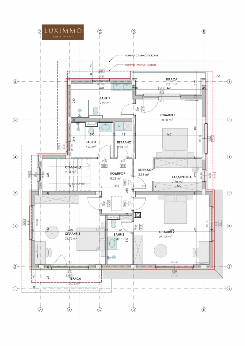 Три просторни спални, три баня с тоалетна и допълнителна гардеробна към мастър спалнята;