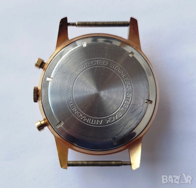 ЧАСОВНИКА Е В МНОГО ДОБРО РАБОТЕЩО СЪСТОЯНИЕ. ОТЛИЧЕН ЦИФЕРБЛАТ И МАРКИРАНА ПОЗЛАТЕНА КАСА. ХРОНОГРАФА РАБОТИ, НО НЕ МОЖЕ ДА НУЛИРА ЗАЩОТО Е СЧУПЕНО ЗЪБЧЕТО НА ПЛАСТИНКАТА, КОЯТО СЕ НАТИСКА ОТ ДОЛНОТО БУТОНЧЕ. ПРОИЗВЕДЕН ПРЕЗ 60-70ТЕ ГОДИНИ. ИМА ДИАМЕТЪР 39 ММ. ПРОДАВА СЕ ЗАЕДНО С ЧЕРНА ВОЕНЕН ТИП КАИШКА. АКО ИМАТЕ ВЪПРОСИ МИ ПИШЕТЕ СЪОБЩЕНИЕ.