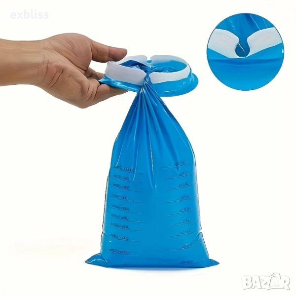 Изработени от здрав полиетилен (PE) в дискретен син цвят, тези торбички са за еднократна употреба, което гарантира максимална хигиена. Тяхната вместимост от 1000 ml (40 fl. oz.) е достатъчна за повечето нужди, а обозначението за обем (градуиране) през 100 ml позволява проследяване на количеството при необходимост. С удобен размер от 38 cm x 17 cm (приблизително), те са лесни за боравене и съхранение.