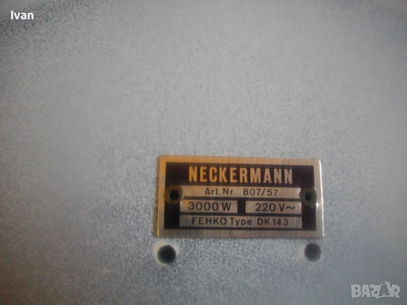 електрически котлон с реална мощност 3000 вата, модел на Некерман. С капак. Корпуса и капака на уреда са емайлирани от старото качество. Масивен - тегло на уреда 8,0 кг. Запазен външен вид и отлично работно състояние. Голяма нагревателна плоча размер ф 185 мм и по-малка размер ф 150 мм.