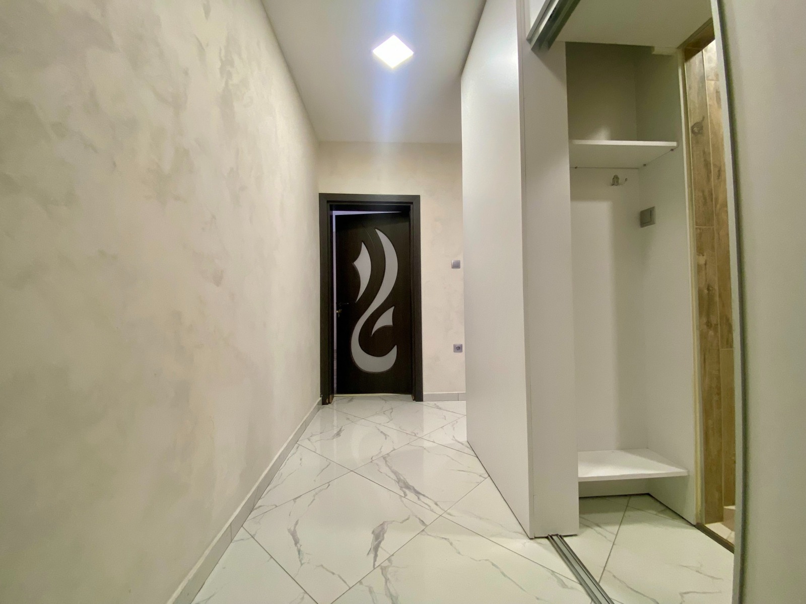 Висококачествен ламинат във всяка стая и гранитогрес в коридора и окачен таван със скрито осветление в голямата спалня.