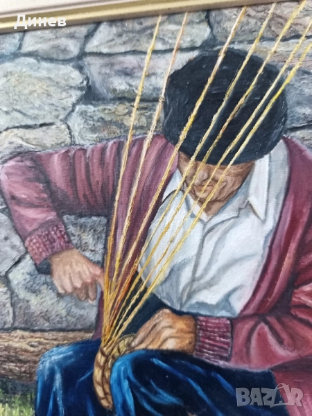 Картината улавя интимен момент от ежедневието на занаятчия, вероятно кошницар, седнал на стол и отдаден на своя труд.