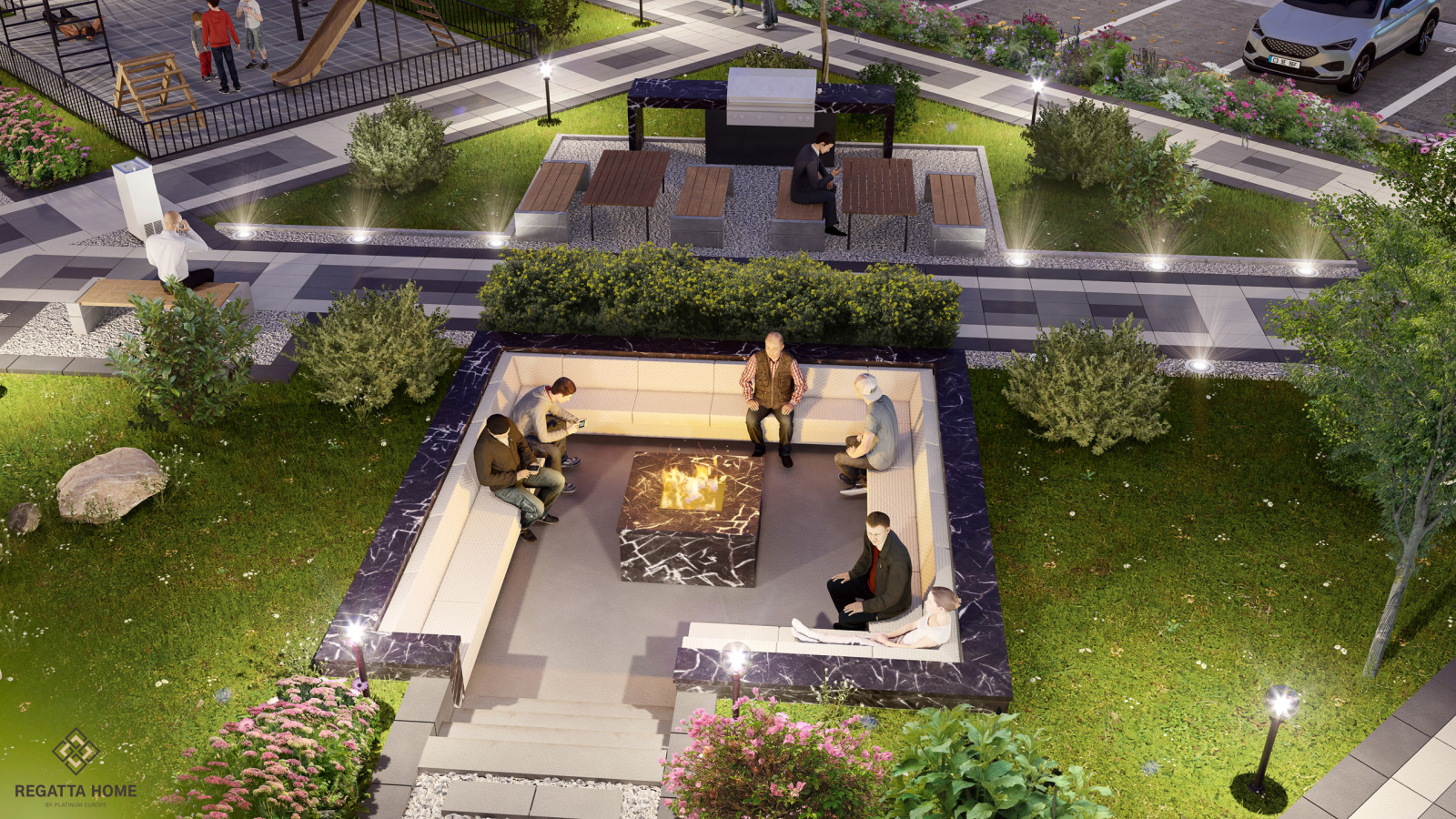 ⏹ Зелени Площи: Разнообразие от обзаведени градински пространства, външни зони за фитнес, барбекю и външно огнище, където можете да се наслаждавате на природата и уюта;