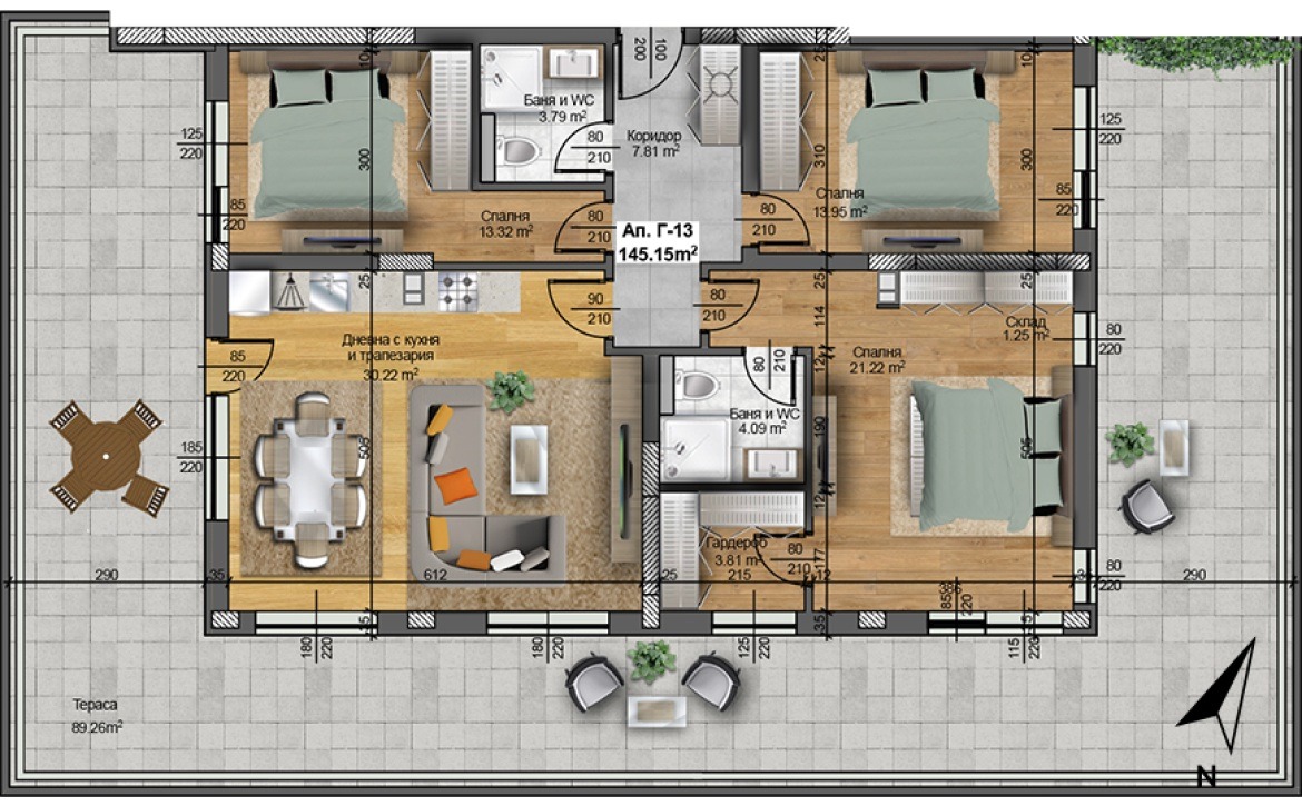 ⏹ Апартамент Г13, който Ви предлагаме, се намира в Секция Г. Общата площ на жилището е разпределена в дневна с трапезария и кухненски бокс, триспални, две баня+WC, преддверие и тераса с площ 89,26 кв.м. и с гледка към Родопите. Изложение: Изток/Юг/Запад.
