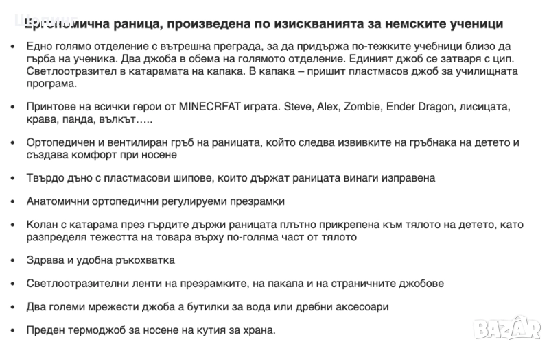 - Едно голямо отделение с вътрешна преграда, за да придържа по-тежките учебници близо да гърба на ученика. Два джоба в обема на голямото отделение. Единият джоб се затваря с цип. Светлоотразител в катарамата на капака. В капака – пришит пластмасов джоб за училищната програма.