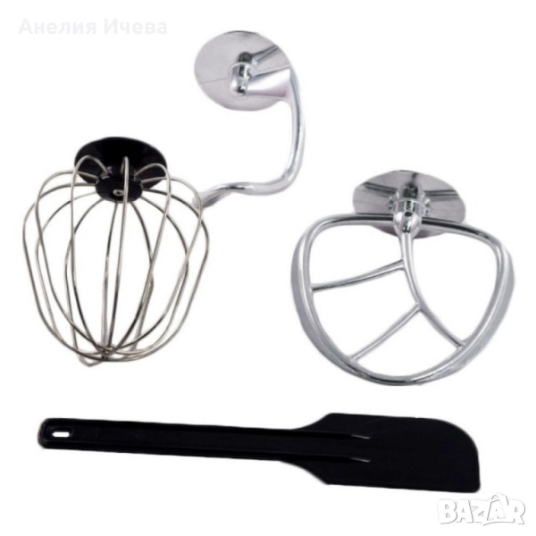 Приставки: кука за тесто, бъркалка, тел за разбиване + шпатула;