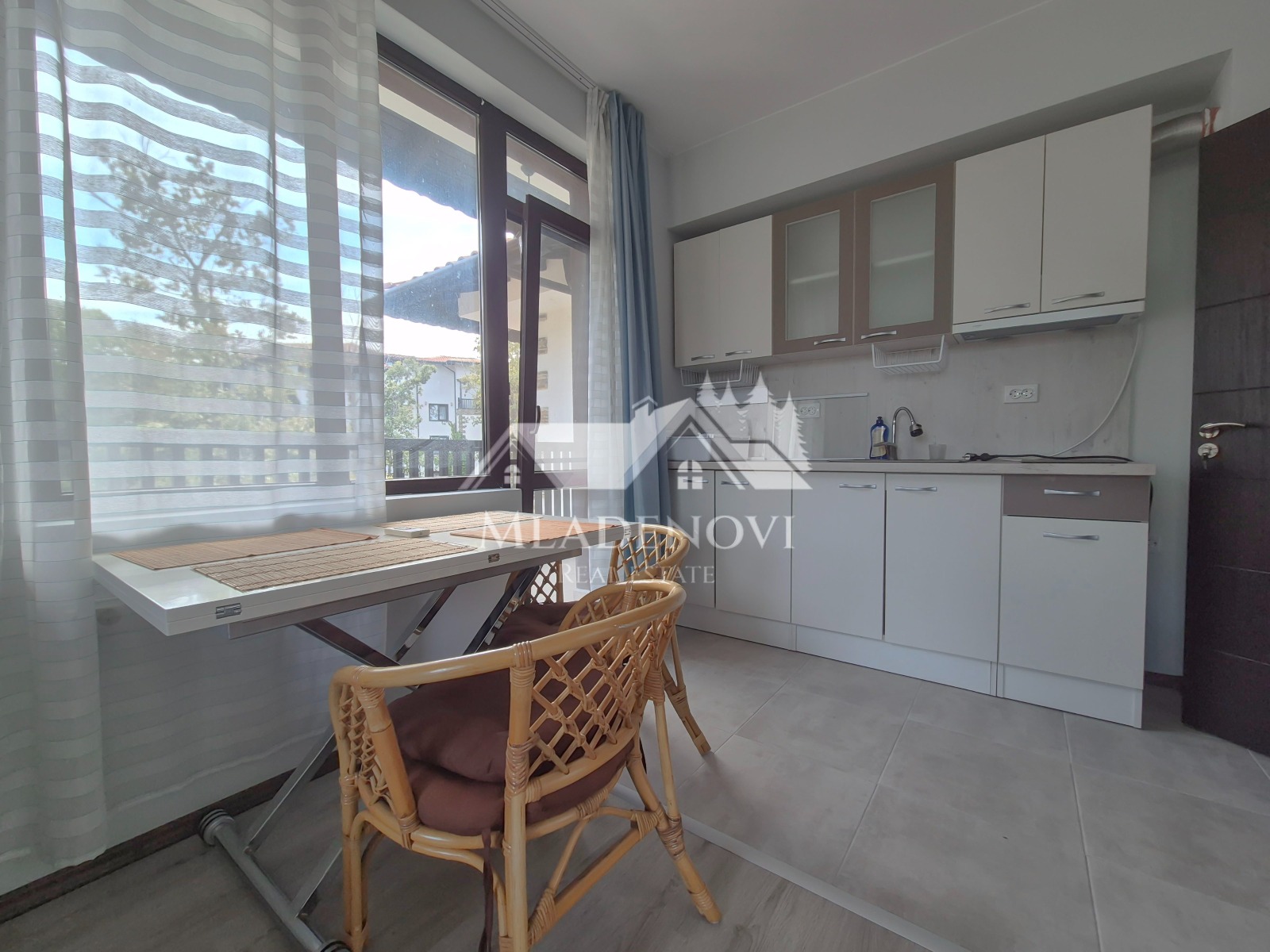 Жилището се намира в комплекс от затворен тип, на 400 м. от плажната ивица и Аквапарка на гр. Приморскко. Отличава се с много зеленина, три басейна, детска площадка и барбекю. Апартаментът е разположен в един от корпусите на комплекса, на четвърти, непоследен етаж с асансьор и с чудесно поддържани общи части. Състои се от просторна всекидневна с кухненски кът, самостоятелна спалня, две тераси, баня с тоалетна и коридор. Апартаментът е изключително светъл и слънчев. Продава се с цялото налично обзавеждане и оборудване. Подходящо е, както за целогодишно ползване, така и за покупка с цел отдаване под наем или нощувки. Таксата поддръжка е в размер 19 Евро/кв.м. годишно. Агенцията съдейства за отпускане на ипотечен кредит за финансиране покупката на този имот, както и безплатно юридическо обслужване през целия процес на сделката.