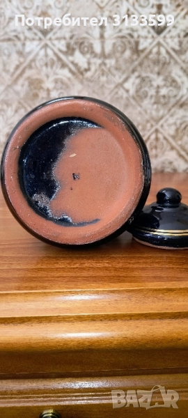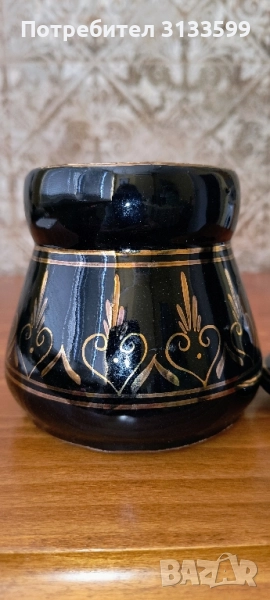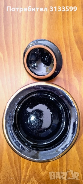 - Керамична ЗАХАРНИЦА - черна, с позлата, част от сервиз за чай, произведен преди повече от 40 години. Сервиза подарих, защото нямаше къде да го съхранявам, преди 7-8 години с оригиналния кашон. Захарницата си я оставих, но имам вече десетина и нямам място за тях. Не е използвана и е в отлично състояние - такова каквото е било при купуването ѝ. Височина: 9,2 см без капак; 11,5 см с капак. В най-широката част: 10 см. Диаметър на отвора: 6 см. ЦЕНА: 8.20 евро
