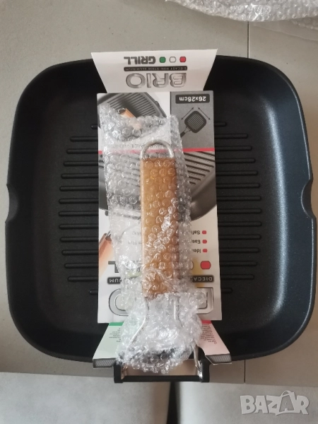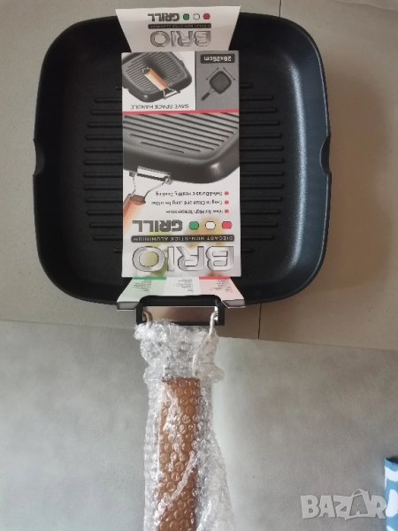 Нов грил тиган на Brio с размери 26 x 26 см. със сгъваема дръжка. Тигана е изработен от висококачествен материал и е подходяща за приготвяне на различни видове храни.
