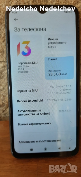 Продавам смартфон Redmi 9 с вградена памет от 32GB, Андроид-12 и оперативна памет от 2,5GB. Устройството е в добро състояние и работи безупречно. Батерията издържа два дни. Единствената забележка е в горният ляв ъгъл на дисплея. Изпращам с преглед и тест.
