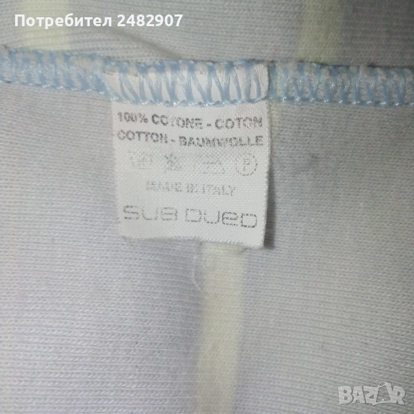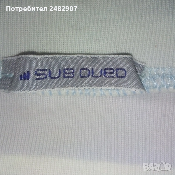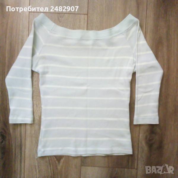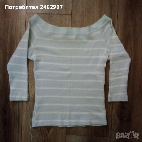 Къса дамска блуза на раета в светло синьо и бяло със 7/8 ръкави и голи рамене, размер XS. Съдържа 100 % памук. Ширина в раменете - 36 см, ширина под мишниците - 40 см, ширина в долната част - 34 см, дължина от рамото до долу - 48 см, дължина на ръкава от рамото - 38,5 см, ширина на ръкава в долната част - 9 см. Много запазена, с нормални следи от износване.
